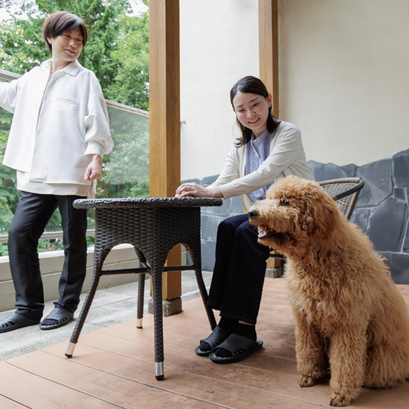 標高1,000メートル級の山々に囲まれた、 落ち着きのある空間でわんちゃんと一緒にほっと一息。また、ホテル周辺にはわんちゃんと過ごせるスポットもたくさん!お散歩グッズもホテルにてご準備しております。那須塩原の自然に囲まれた環境でわんちゃんとの大切な時間をお楽しみください。
