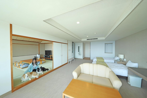 海を眺める人工芝のドッグランに直結し、和を基調とした広めのお部屋です。いつでも気楽に、お部屋からそのまま愛犬と一緒にドッグランへ出ることができます。
